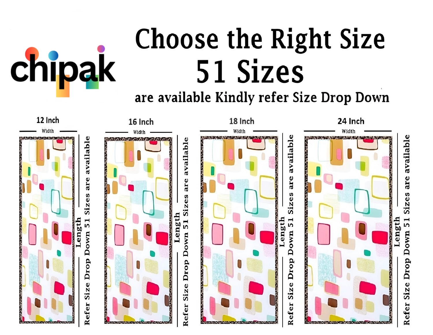 GLASS STICKER SIZE: 51 Sizes available in the drop down (in Inches) Choose perfect size for your window or Door, for example if your Glass size is 12 inches of width and 48 inches of Length then you should select 12×48 Inch and add quantity as per your requirement, You can also refer image number 2 for better understanding.