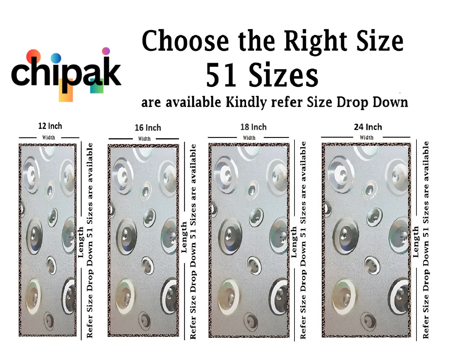 GLASS STICKER SIZE: 51 Sizes available in the drop down (in Inches) Choose perfect size for your window or Door, for example if your Glass size is 12 inches of width and 48 inches of Length then you should select 12×48 Inch and add quantity as per your requirement, You can also refer image number 2 for better understanding.