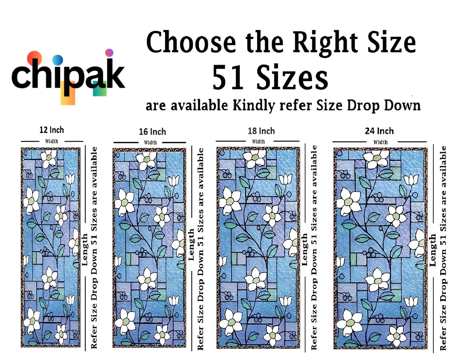 GLASS STICKER SIZE: 51 Sizes available in the drop down (in Inches) Choose perfect size for your window or Door, for example if your  Glass size is 12 inches of width and 48 inches of Length then you should select 12×48 Inch and add quantity as per your requirement, You can also refer image number 2 for better understanding.