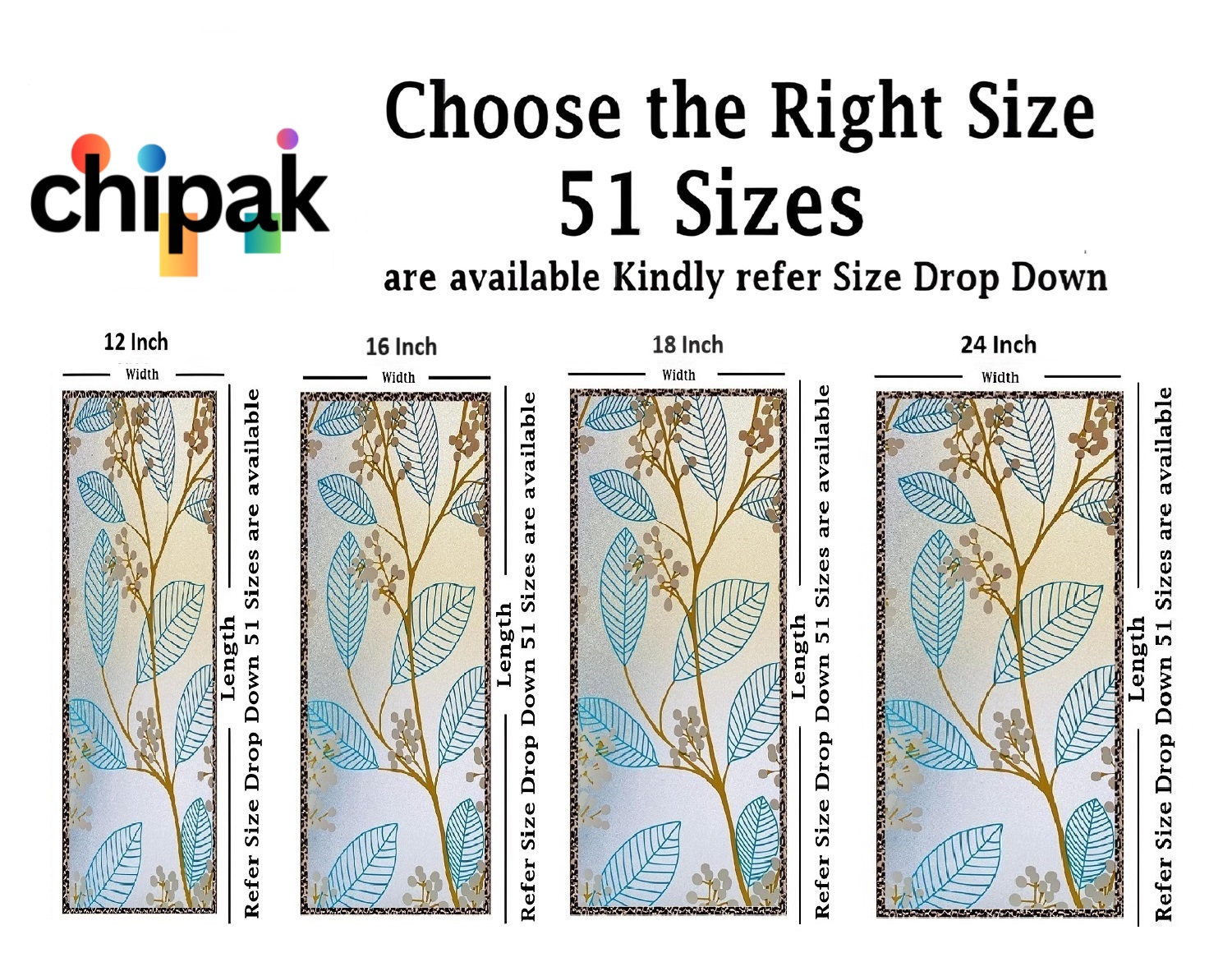 GLASS STICKER SIZE: 51 Sizes available in the drop down (in Inches) Choose perfect size for your window or Door, for example if your Glass size is 12 inches of width and 48 inches of Length then you should select 12×48 Inch and add quantity as per your requirement, You can also refer image number 2 for better understanding.