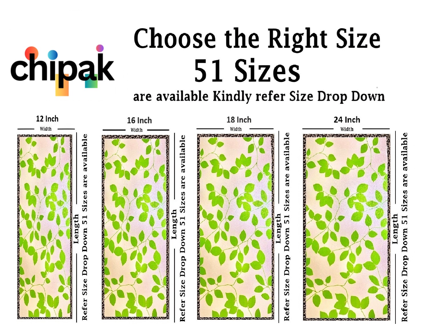 GLASS STICKER SIZE: 51 Sizes available in the drop down (in Inches) Choose perfect size for your window or Door, for example if your Glass size is 12 inches of width and 48 inches of Length then you should select 12×48 Inch and add quantity as per your requirement, You can also refer image number 2 for better understanding.