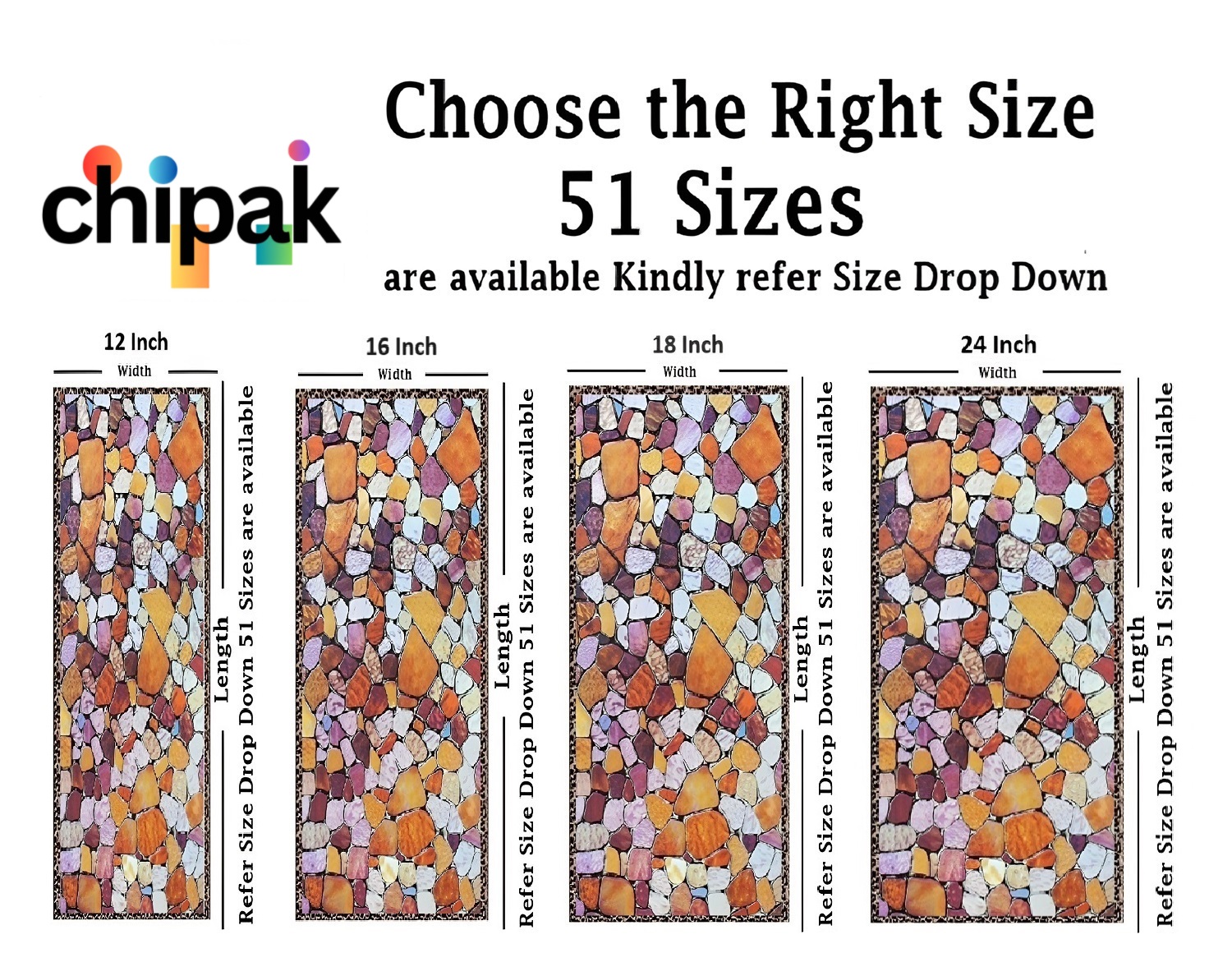 GLASS STICKER SIZE: 51 Sizes available in the drop down (in Inches) Choose perfect size for your window or Door, for example if your Glass size is 12 inches of width and 48 inches of Length then you should select 12×48 Inch and add quantity as per your requirement, You can also refer image number 2 for better understanding.