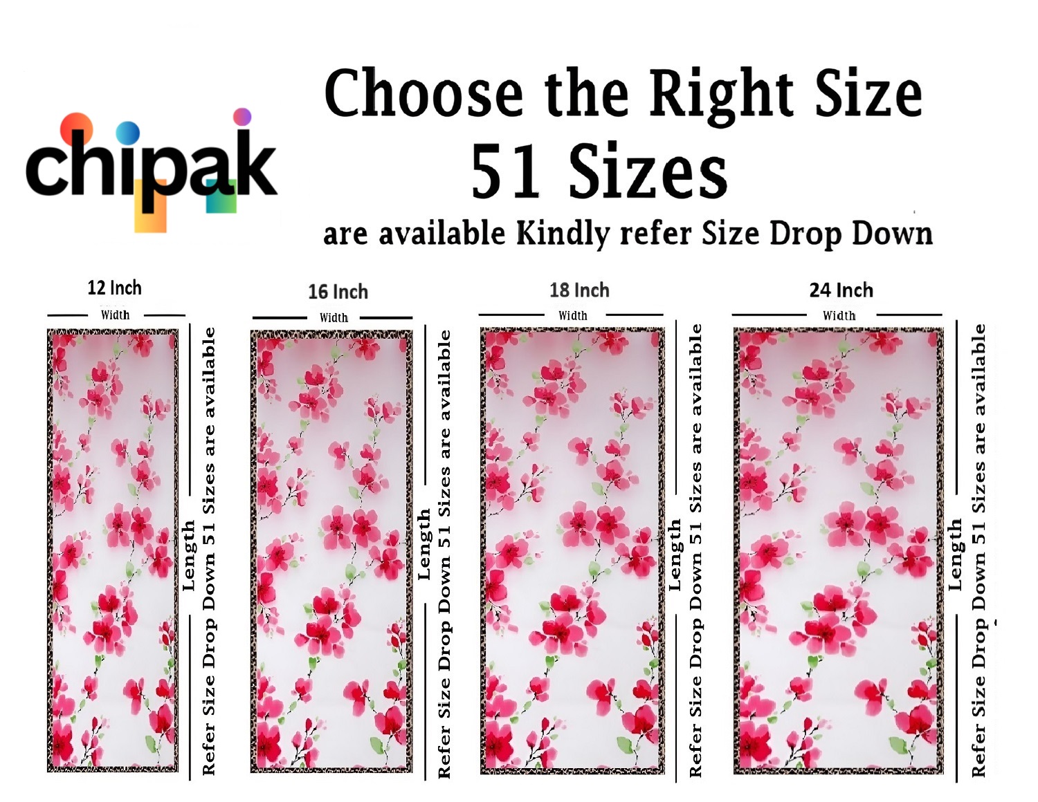 GLASS STICKER SIZE: 51 Sizes available in the drop down (in Inches) Choose perfect size for your window or Door, for example if your  Glass size is 12 inches of width and 48 inches of Length then you should select 12×48 Inch and add quantity as per your requirement, You can also refer image number 2 for better understanding.