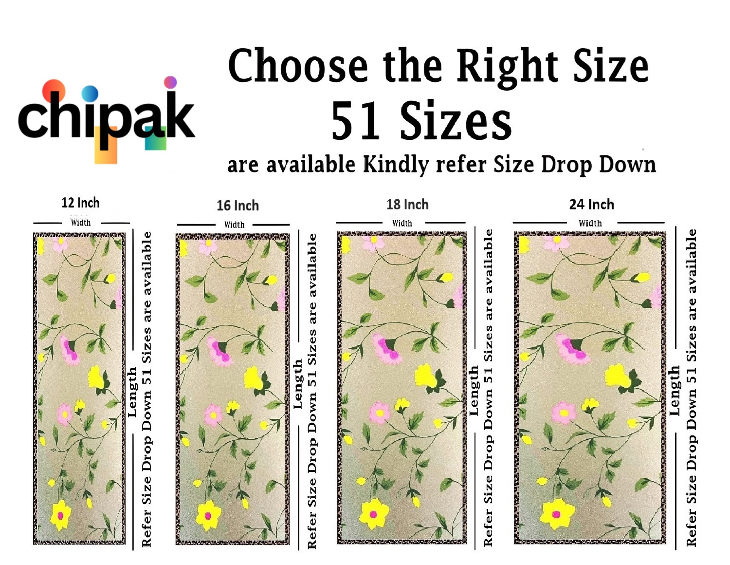 GLASS STICKER SIZE: 51 Sizes available in the drop down (in Inches) Choose perfect size for your window or Door, for example if your Glass size is 12 inches of width and 48 inches of Length then you should select 12×48 Inch and add quantity as per your requirement, You can also refer image number 2 for better understanding.